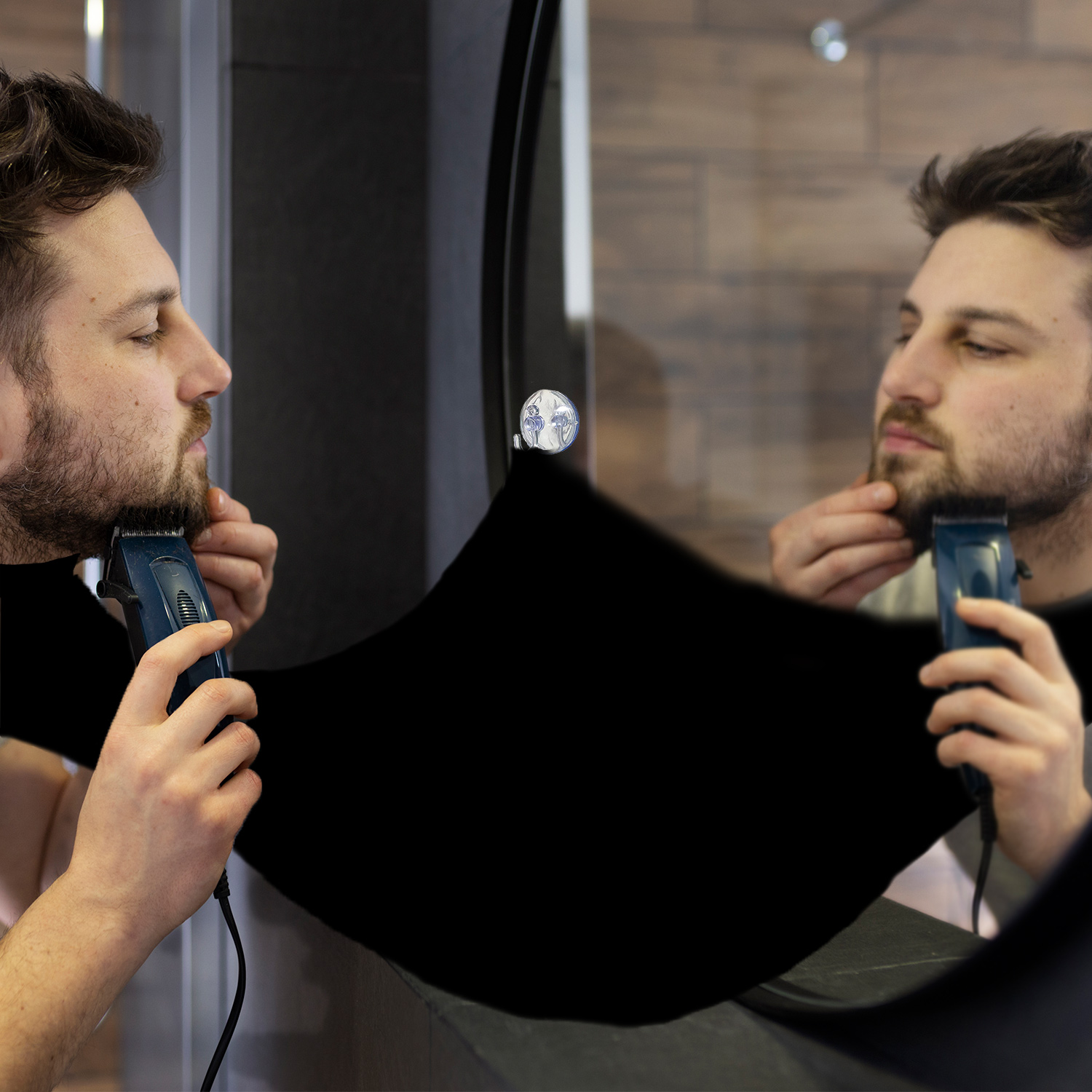 Et barberingsforklæde beskytter din badeværelsesspejl, håndvask og gulv mod skægstubbe og hår.