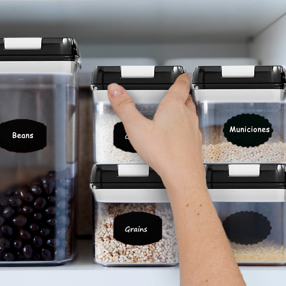 Opbevaringsbøtterne kommer med klistermærker og en tusch, så du kan skrive navn på de forskellige opbevaringsbøtter, så du nemt kan identificere, hvad der er i dem. Bøtterne er lavet af stærkt plastik, der tåler opvask, så du nemt kan holde dem rene og hygiejniske.