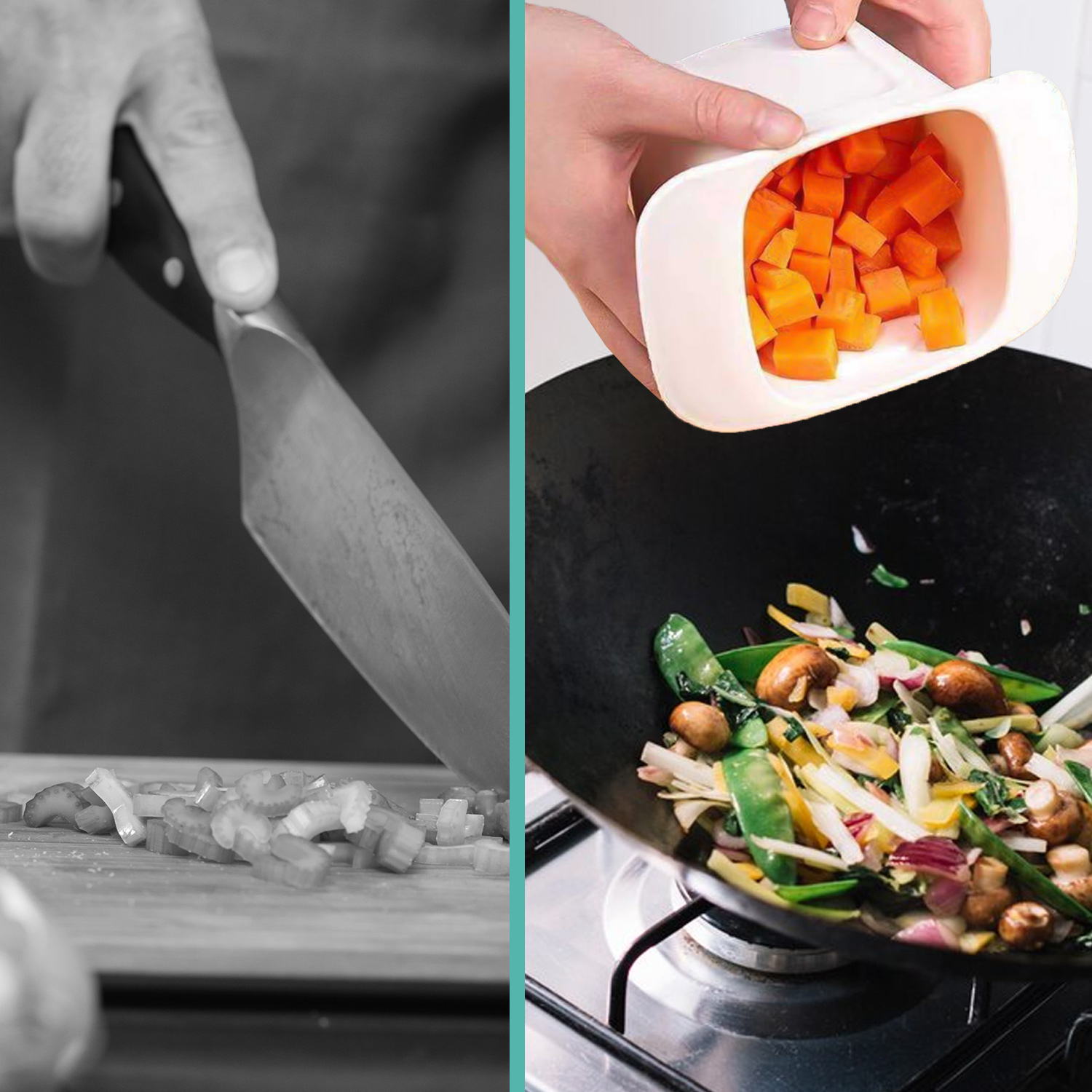 - Åbn beholderen og hæld de hakket ingredienser ud i din opskål eller gryde.