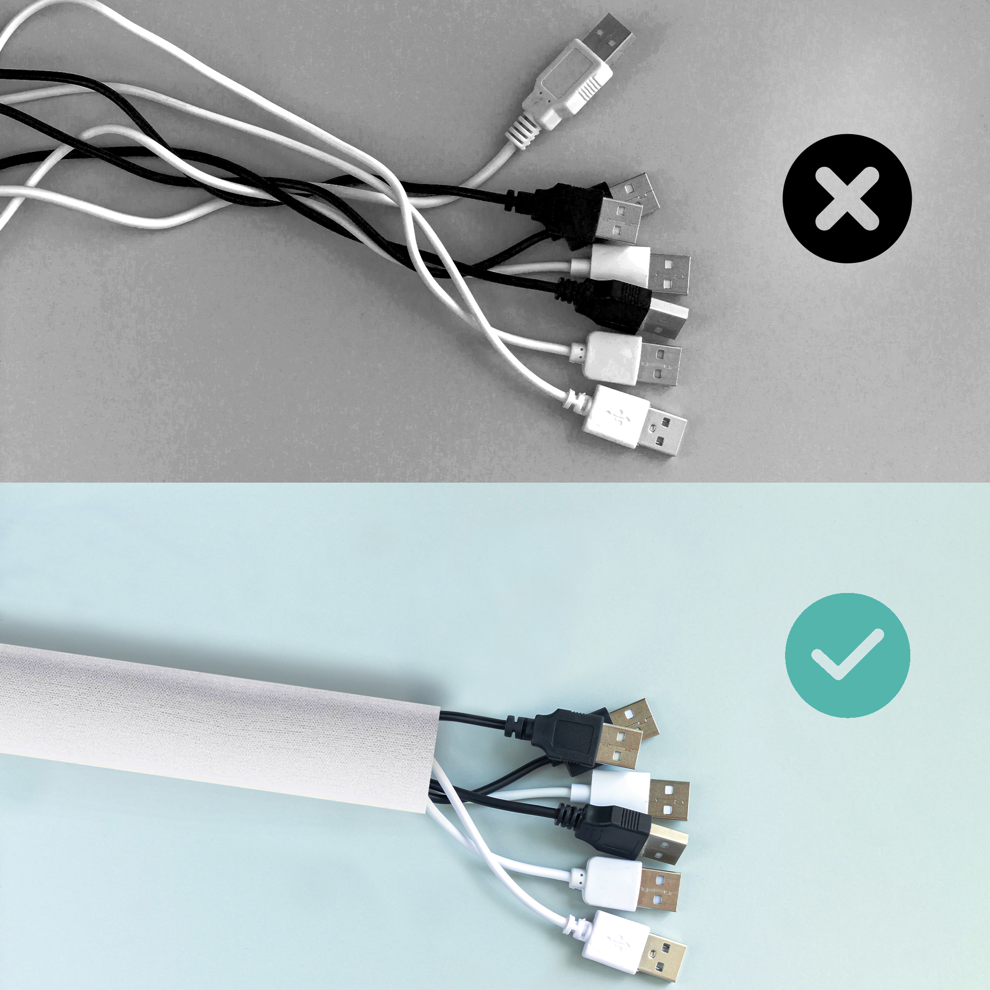 - Estetik: Ingen kan lide synet af rodede kabler. Med vores kabelsok ser dit rum straks mere ryddeligt og organiseret ud.