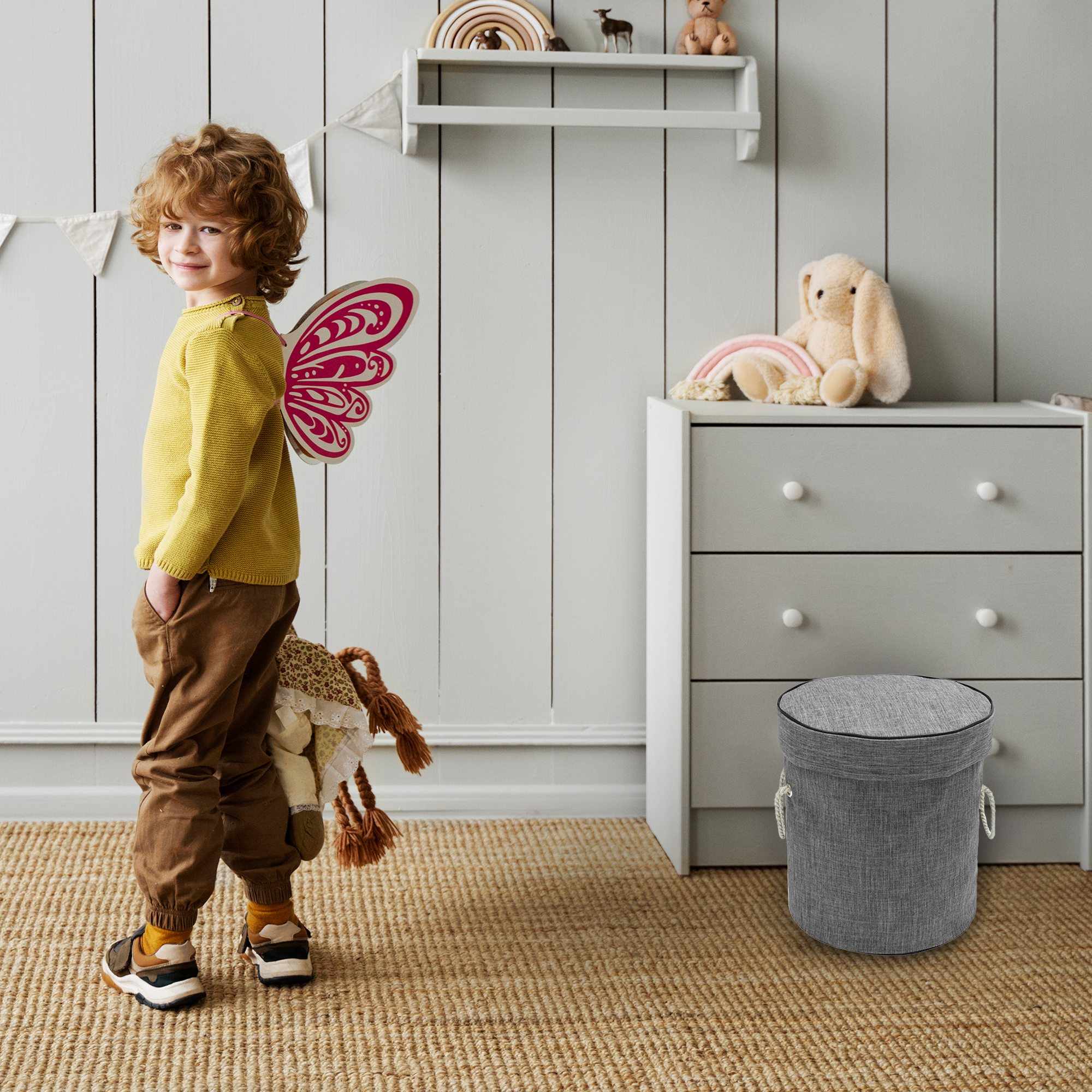Oprydningsspanden til legetøj har et smukt design og elegant design med sin grå farver og rebhåndtag på siden, hvilket gør at man sagtens kan ha spanden til at stå fremme i sit hjem. Måler 30 cm i højden og 30 cm i diameteren, så den er nem at tage med overalt.