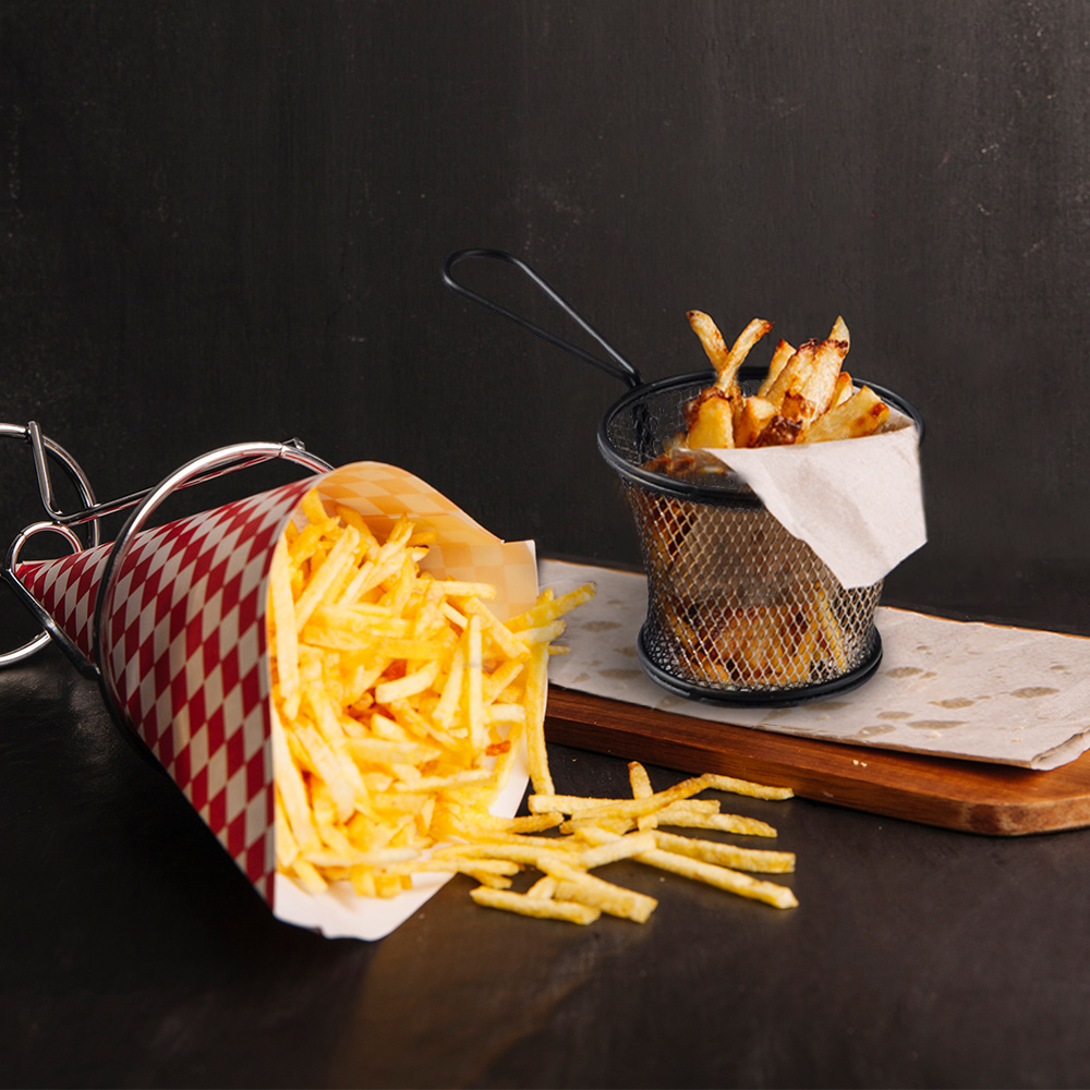 For den fulde oplevelse bør du overveje at parre dine Pommes Frites Kurv med vores pommes frites papir, News. Dette papir er skabt specielt til at holde på varmen og bevare sprødheden i dine pommes frites. Det giver ikke kun en ekstra beskyttelse, men det giver også din servering et autentisk udtryk.